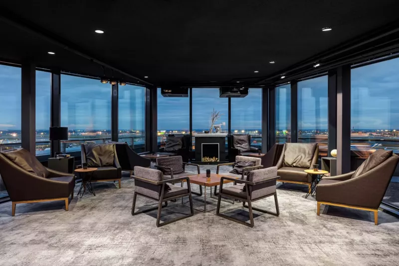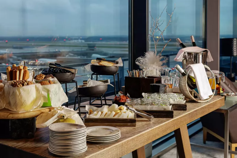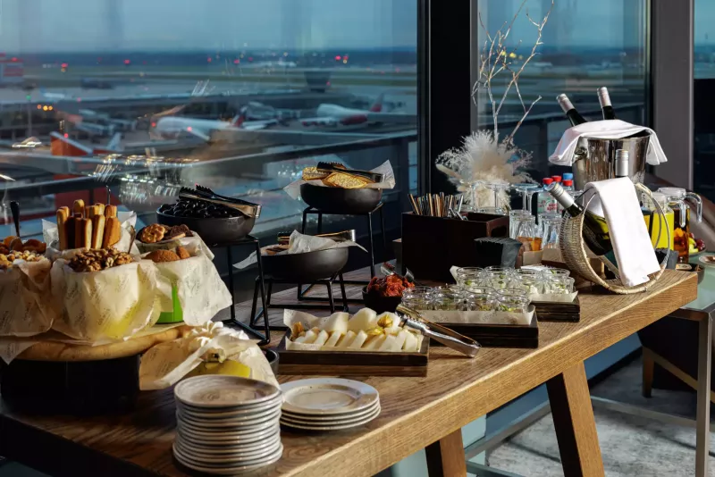 Лаунж с атмосферой, где каждая деталь создана для вашего удовольствия. С потрясающими панорамными видами на взлетное поле, вы сможете наслаждаться не только живописными пейзажами, но и богатым ассортиментом закусок и напитков в уютной обстановке.